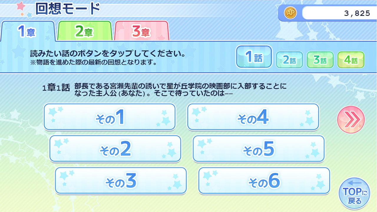 回想モードでは、開放済みのストーリーを読み返すことができます。