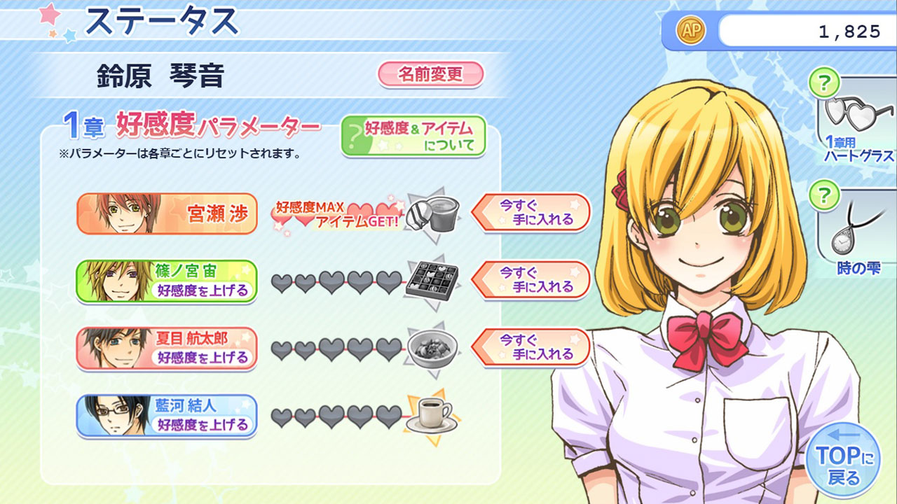 ショップで『○章ハートグラス』を購入すると、その章の好感度増減がわかるようになりますよ♪