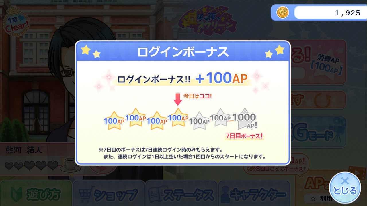 1日1回、ログイン時にボーナスAPをもらうことができます。