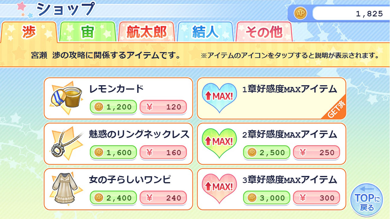 ショップでは、ストーリーを有利に進めるアイテムや、キャラクターの攻略に必要なアイテムをゲットできます。