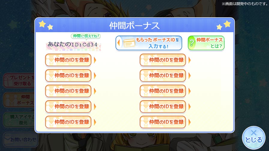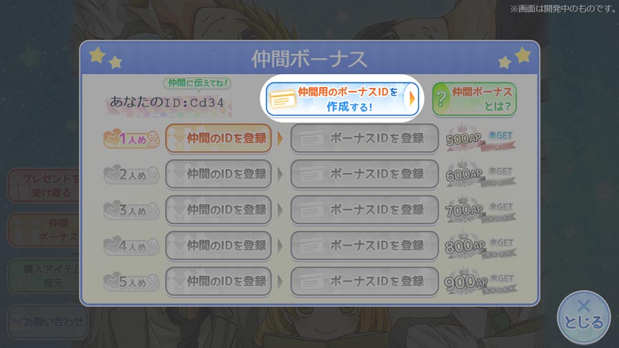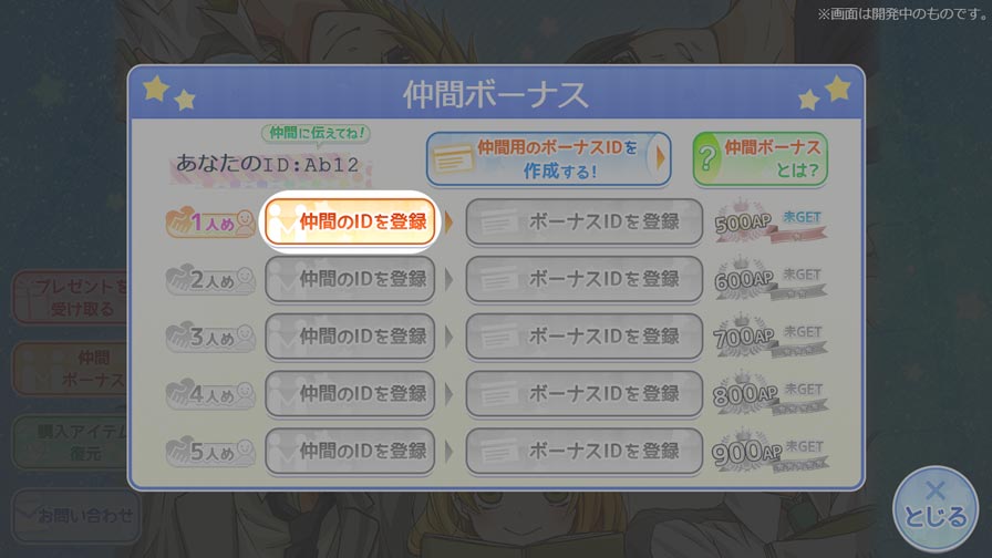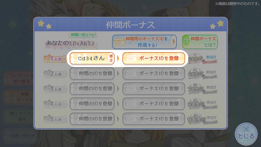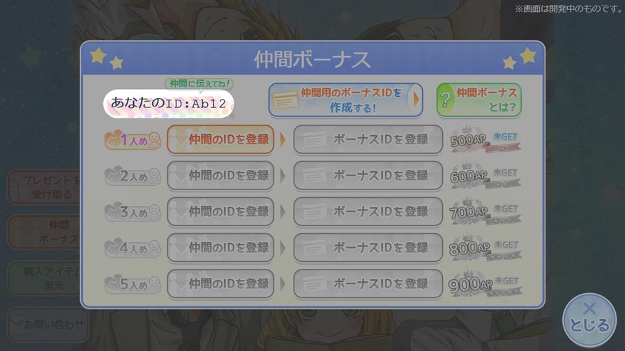 仲間ボーナスとは、同じアプリをプレイしている仲間から【ID】と【ボーナスID】を教えてもらい、それらを自分のアプリに登録することでAPがもらえる機能です!