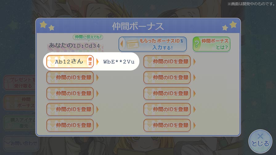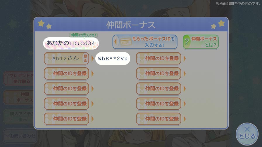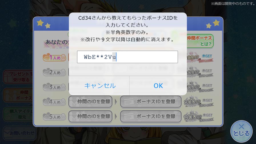 次は私がボーナスゲットに協力する番だね。仲間のIDはもう教えてもらってるから、ボーナスID作成ページで『Cd34』を入力して……