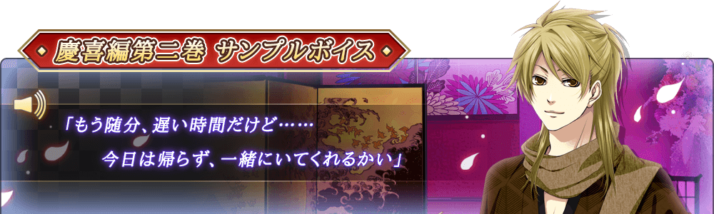 昨日18日に、慶喜本編第二巻―暗の抄―が発売となっております!ヾ(*´∀`*)ノ楽しんで頂けていれば何よりですが、「まだ買おうかどうか迷ってる」という方のためにも、二巻の新規サンプルボイスを公開させて頂きます!